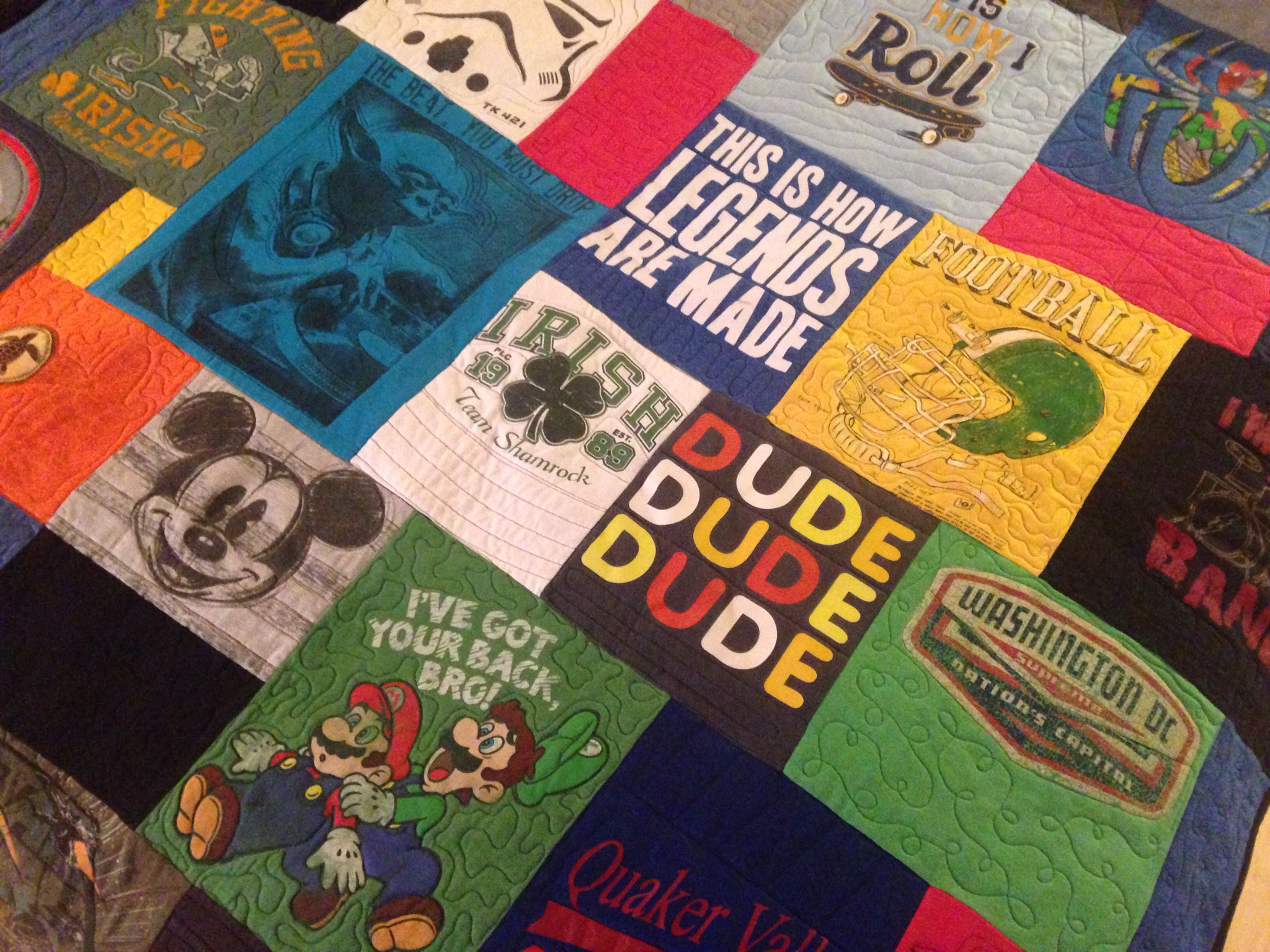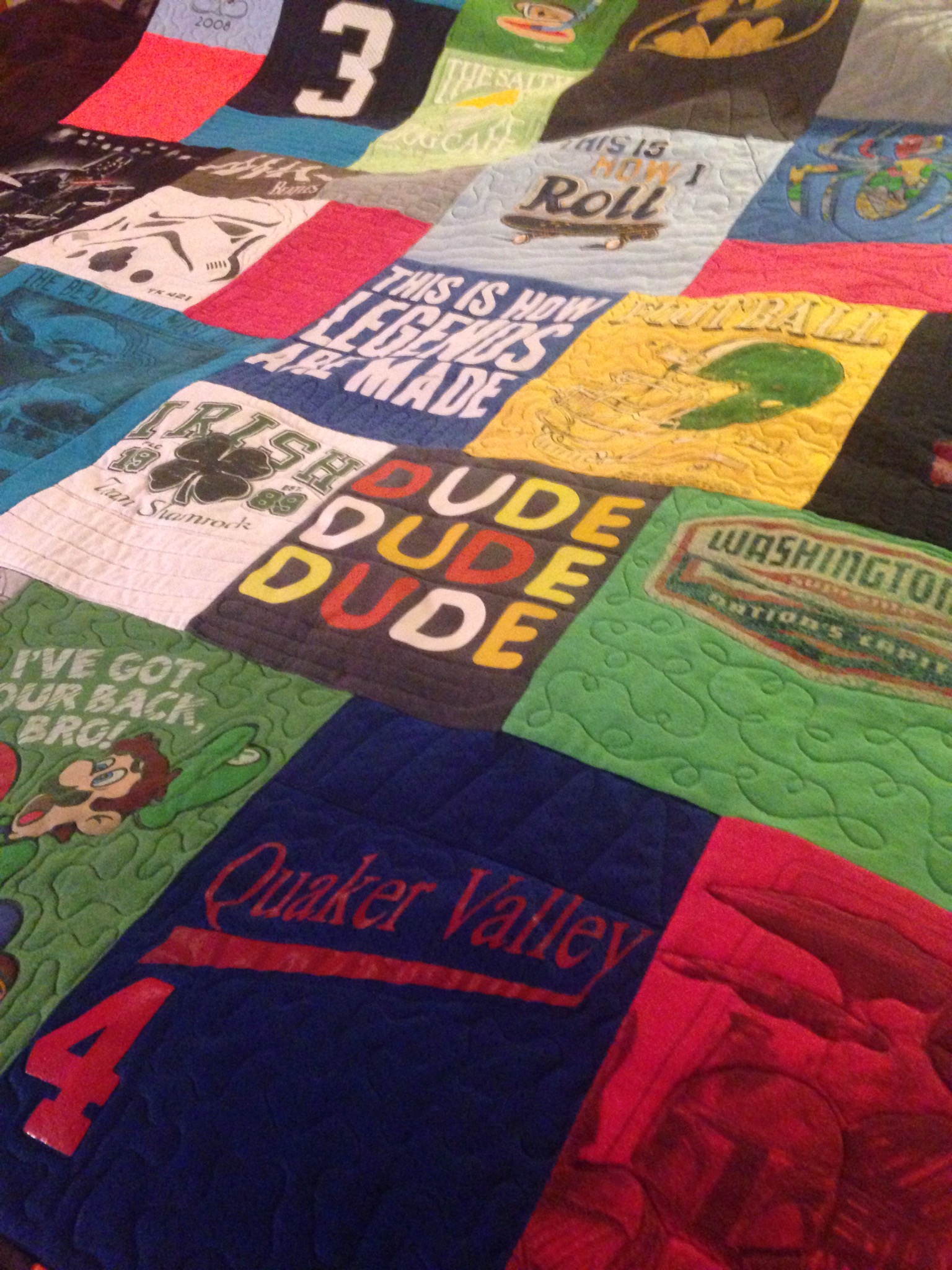 Meghan surprised me this evening with an incredible gift: a memory quilt with some of Owen’s favorite t-shirts. The care and craftsmanship are unbelievable. Overwhelmed.